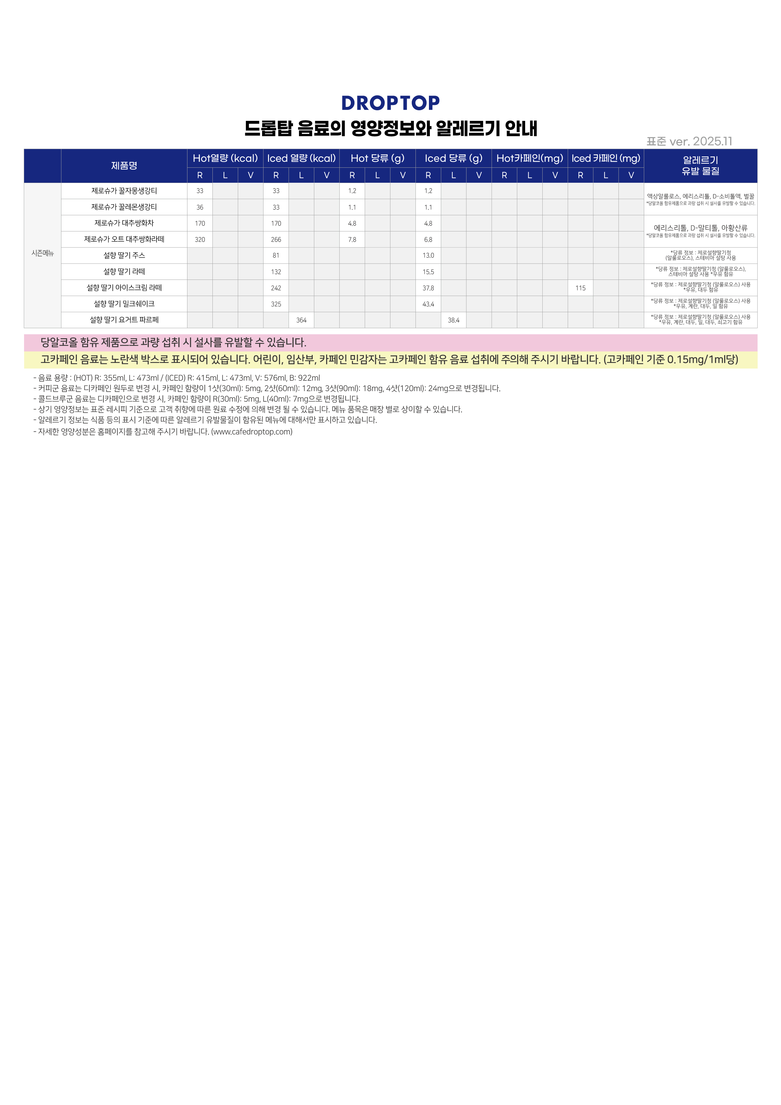 | 제목 | 25. 11 드롭탑 매장 딸기시즌 판매메뉴 영양성분 및 알레르기 유발물질 안내 |